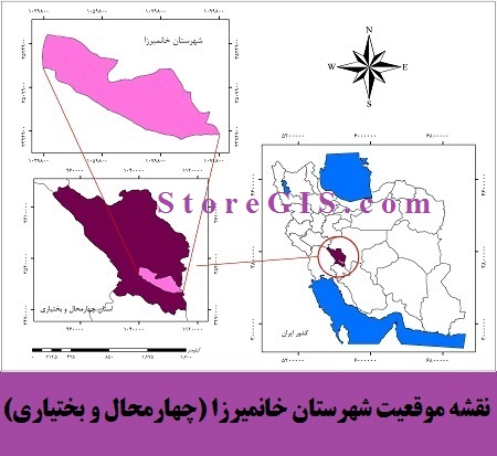 نقشه موقعیت جغرافیایی شهرستان خانمیرزا واقع در استان چهارمحال و بختیاری با کیفیت عالی (dpi: 300) و حجم مناسب، به صورت رنگی و مناسب برای بخش “معرفی منطقه” در کارهای پژوهشی.