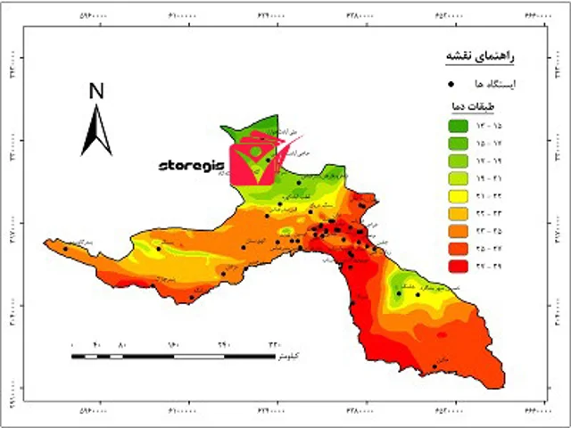 نقشه طبقات دما استان هرمزگان تصویر طبقات دما و ایستگاه های هواشناسی و اقلیم شناسی.