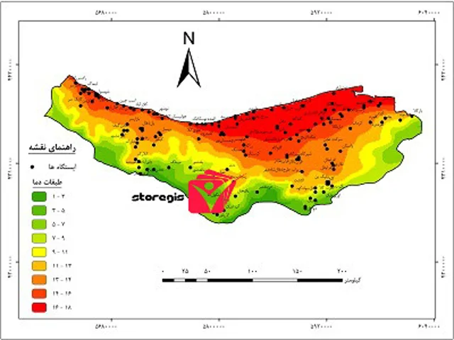 نقشه طبقات دما استان مازندران تصویر طبقات دما و ایستگاه های هواشناسی و اقلیم شناسی.